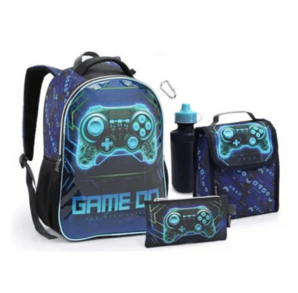 Kit completo com mochila, lancheira e estojo, ideal para meninos fãs de games.