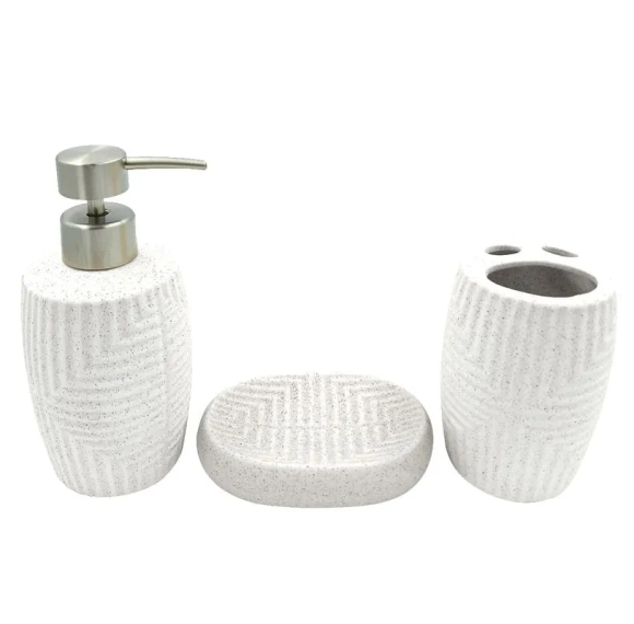 Este conjunto contém 3 peças essenciais para o dia a dia: dispenser para sabonete líquido, porta-escovas e saboneteira. Cada item possui acabamento refinado e visual clean, ideal para compor banheiros modernos, minimalistas ou clássicos. Por ser sortido, oferece variedade de estampas e cores, mantendo sempre a mesma qualidade premium.