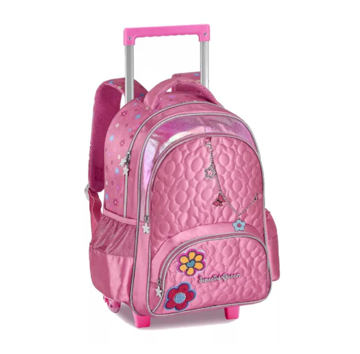 Com tamanho 45x30cm, oferece amplo espaço interno para cadernos, livros, estojo e demais materiais. O sistema de carrinho com alça retrátil e rodinhas reforçadas garante um transporte confortável e prático, ideal para o dia a dia escolar ou viagens.